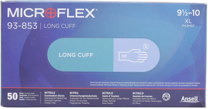 Der Untersuchungshandschuh Microflex® 93-853 aus Nitril eignet sich optimal für den Schutz vor höheren Risiken. Der niedrige AQL-Wert von 0,65 und die verlängerte Stulpe schützen zuverlässig gegen vielfältige Gefahren. Der Microflex® 93-853 bietet einen robusten Schutz vor Chemikalienspritzer und wurde auch für eine Verwendung in Verbindung mit verschiedenen Zytostatika getestet, wie: Amethopterinhydrat, Carboplatin, Cyclophosphamid (Cytoxan), Cytarabin, Dacarbazin (DTIC), Fluorouracil, Melphalan (Alkeran) Methotrexat, Mitoxantron, Paclitaxel (Taxol), Thiotepa oder Vincristinsulfat. Die texturierten Fingerspitzen bieten einen verstärkten Nassund Trockengriff für das sichere Handhaben von Materialien und Instrumenten. Die CE-Zertifizierung macht diesen Handschuh zur idealen Wahl für onkologische Stationen.