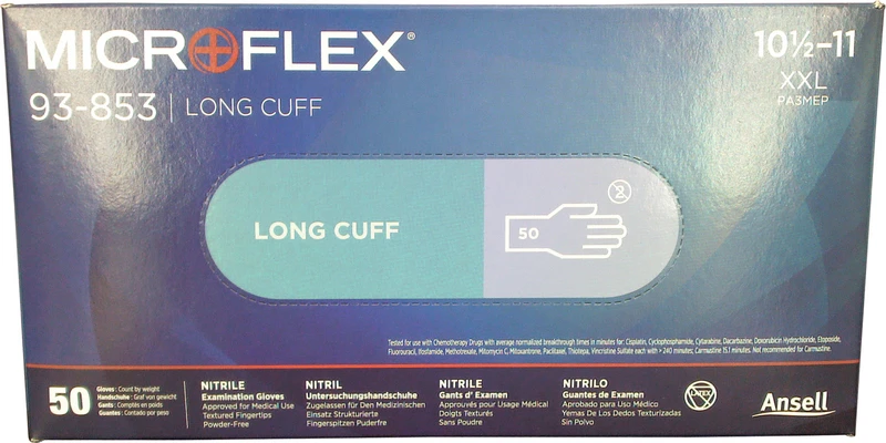 Der Untersuchungshandschuh Microflex® 93-853 aus Nitril eignet sich optimal für den Schutz vor höheren Risiken. Der niedrige AQL-Wert von 0,65 und die verlängerte Stulpe schützen zuverlässig gegen vielfältige Gefahren. Der Microflex® 93-853 bietet einen robusten Schutz vor Chemikalienspritzer und wurde auch für eine Verwendung in Verbindung mit verschiedenen Zytostatika getestet, wie: Amethopterinhydrat, Carboplatin, Cyclophosphamid (Cytoxan), Cytarabin, Dacarbazin (DTIC), Fluorouracil, Melphalan (Alkeran) Methotrexat, Mitoxantron, Paclitaxel (Taxol), Thiotepa oder Vincristinsulfat. Die texturierten Fingerspitzen bieten einen verstärkten Nassund Trockengriff für das sichere Handhaben von Materialien und Instrumenten. Die CE-Zertifizierung macht diesen Handschuh zur idealen Wahl für onkologische Stationen.