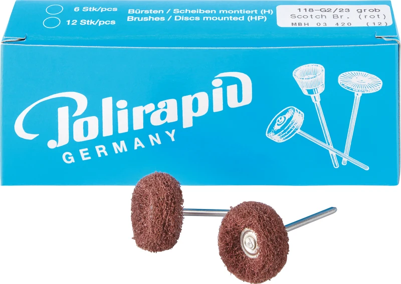 Produktinformationen "Miniaturbürsten 3M Scotch-Brite Packung 12 Stück rot grob, HP, 2 Scheiben 3M Scotch-Brite, K: 280-320, Ø 23 mm"