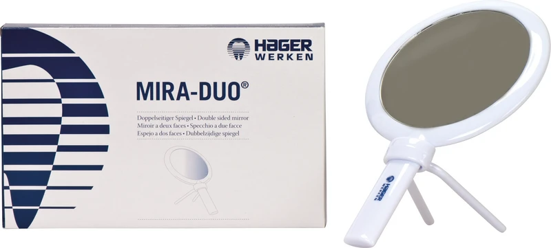 Doppelseitiger Patientenspiegel. Vorderseite 1:1, Rückseite 2-fache Vergrößerung. Als Hand- oder Standspiegel zu benutzen, Ø 13 cm. Ideal zur Kontrolle - vor allem in der Prophylaxe.