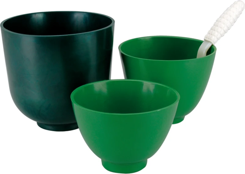 Grüne, flexible Anmischgefäße. Einfach zu reinigen, für Alginat, Gips etc. Besonders hochwertiges, flexibles Material. In drei Größen / Höhen lieferbar.