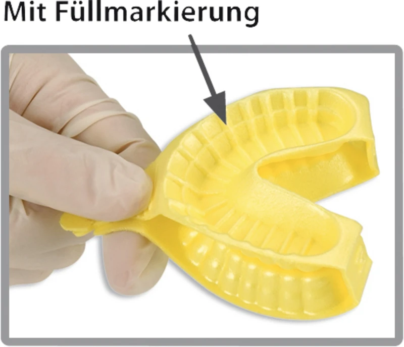 Aus leichtem, flexiblem Kunststoff, Applikationslöffel für Fluoridgel. Doppellöffel für OK und UK gleichzeitig. Mit Abfüllmakierung.