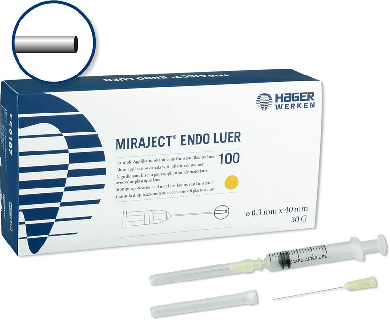Stumpfe, biegsame Kanüle für die Endodontie. Applikation von Flüssigkeiten und Pasten in den Wurzelkanal in feinster, kontrollierbarer Dosierung.