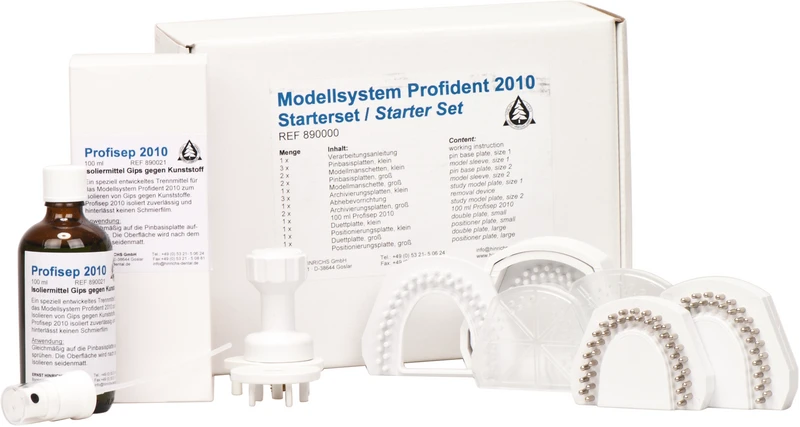 Starterset 3 Pinbasisplatten klein, 2 Pinbasisplatten groß, 3 Archivierungsplatten klein, 2 Archivierungsplatten groß, 2 Modellmanschetten klein, 1 Modellmanschette groß, 1 Abhebevorrichtung, 100 ml Profisep 2010, 1 Positionierungsplatte klein, 1 Positionierungsplatte groß, 1 Verarbeitungsanleitung