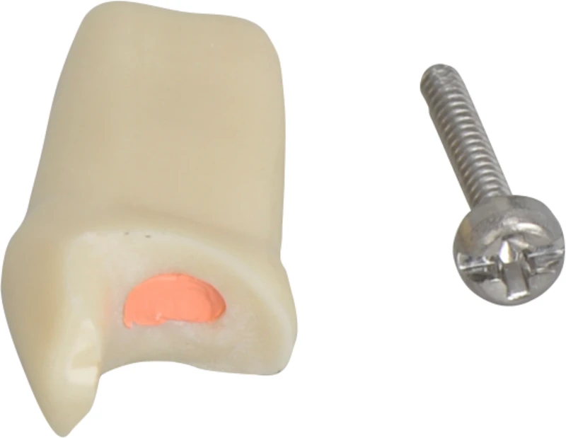 Modellzähne passend zu Modellsockel AG-3 mit Schrauben zur Simulation der Situation nach Wurzelbehandlung bei Inzisiv, Prämolaren und Molaren; Zugangsöffnungen mit Guttapercha gefüllt; sie eignen sich für Übungen zur Herstellung von direkten und indirekten Stiftaufbauten aus plastischen und nicht-plastischen (metallischen) Werkstoffen.