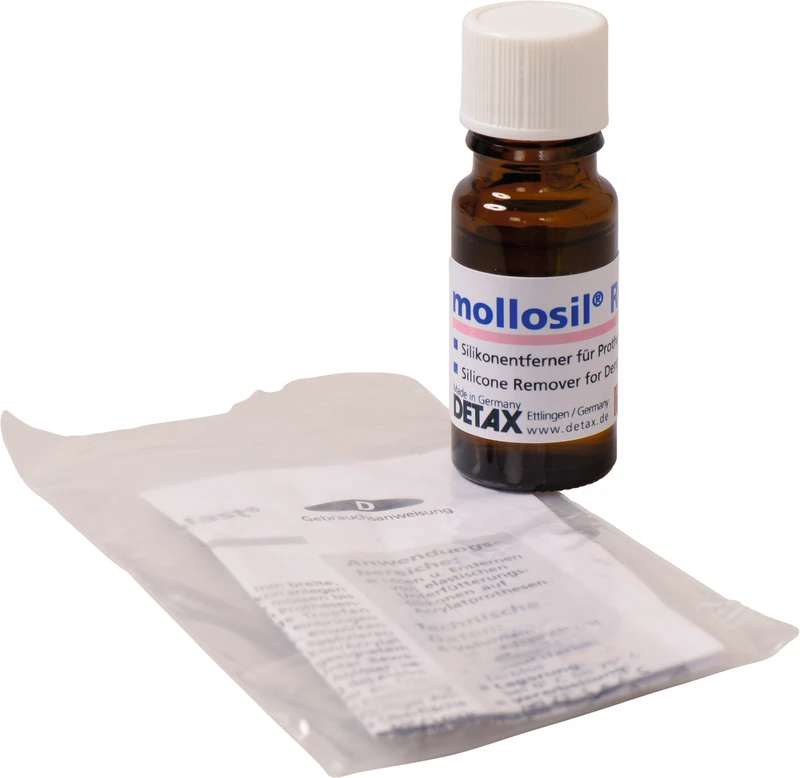 mollosil® Remover Tropfflasche - zum schnellen und sicheren Lösen der Verbindung zwischen elastischen Unterfütterungssilikonen und Prothesenacrylat. Einfache Anwendung, zeitaufwändiges Entfernen durch Fräsen entfällt. Keine Rückstände und Wechselwirkung bei wiederholter Unterfütterung.