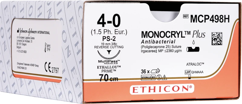MONOCRYL Plus ist ein synthetisches, resorbierbares Nahtmaterial mit einer monofilen Struktur. Dieses antiseptisch beschichtete Nahtmaterial mit Triclosan zeigt eine Reduzierung des Risikos von postoperativen Wundinfektionen.