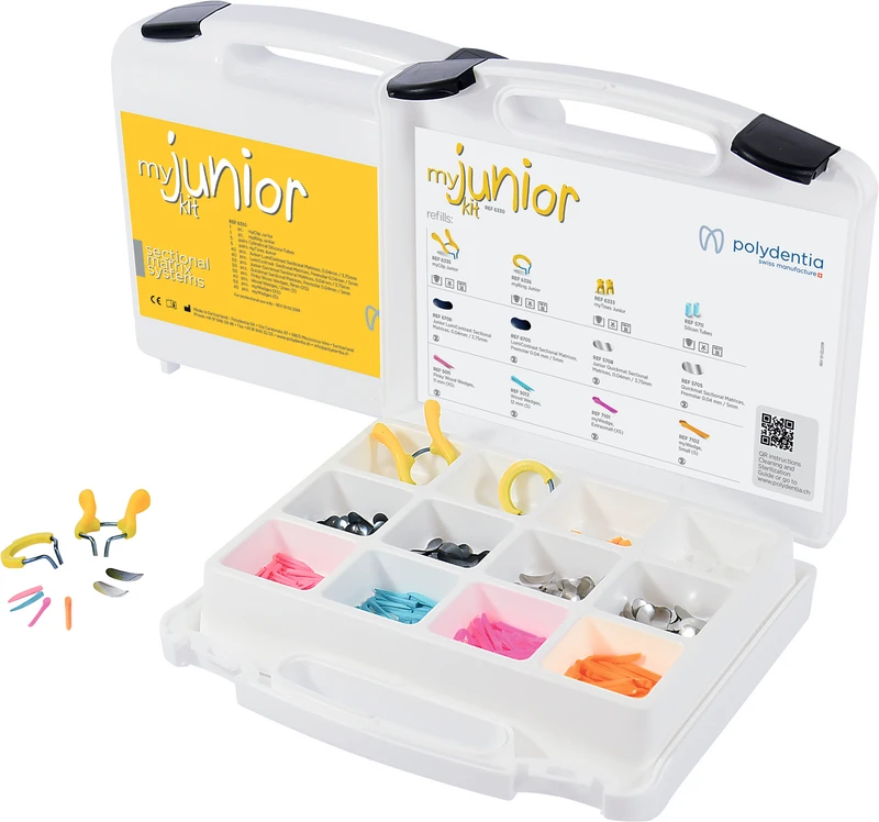 myJunior Kit ist das erste Teilmatrizen-System für die Kinderzahnheilkunde, das speziell für kleinere Milch- und junge bleibende Zähne entwickelt wurde. Es ermöglicht Zahnärzten, vorhersagbare Restaurationen und ideale Kontaktflächen zu erzielen. Das Kit bietet kinderfreundliche Lösungen, die Behandlungszeit sparen, Kinder weniger belasten und ihnen eine schnelle Rückkehr zu ihren Lieblingsaktivitäten ermöglichen.
