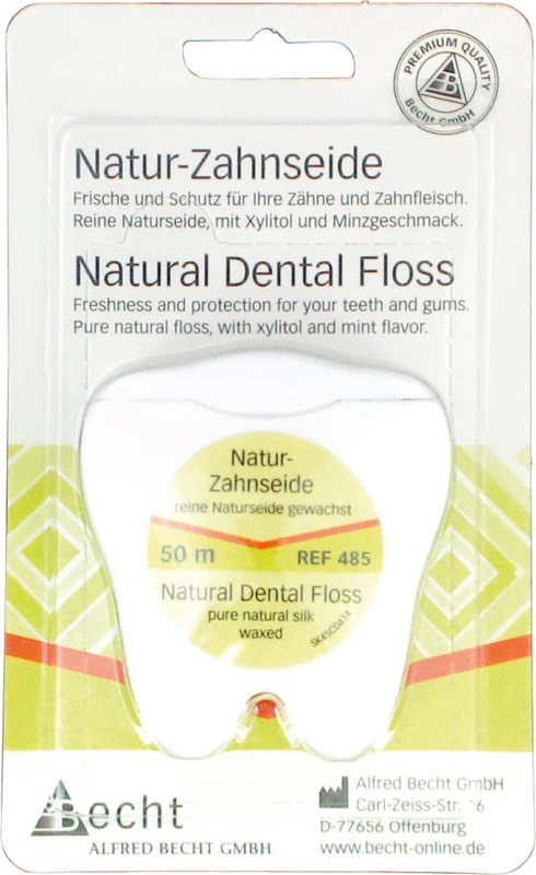 Natur-Zahnseide für die besonders gründliche Reinigung der Zwischenräume. Zur Unterstützung der Remineralisierung des Zahnes wurde die Zahnseide mit dem Wirkstoff Xylitol beschichtet. Natur-Zahnseide in der Zahnbox, geblistert, mit Minze, Xylitol und Spiegelfolie.