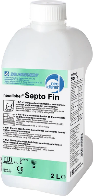 neodisher Septo Fin eignet sich zur manuellen Desinfektion von vorgereinigten thermostabilen und thermolabilen Instrumenten, inklusive flexibler Endoskope, TEE-Sonden, MIC-Instrumenten und Anästhesieutensilien. neodisher Septo Fin ist formaldehyd- und glyoxalfrei (auch frei von Formaldehyd-Abspaltern!) und hat eine umfassende Desinfektionswirkung (bakterizid, mykobakterizid, fungizid, viruzid und wirksam gegen C. difficile), die der aktuellen KRINKO/BfArM-Empfehlung entspricht.