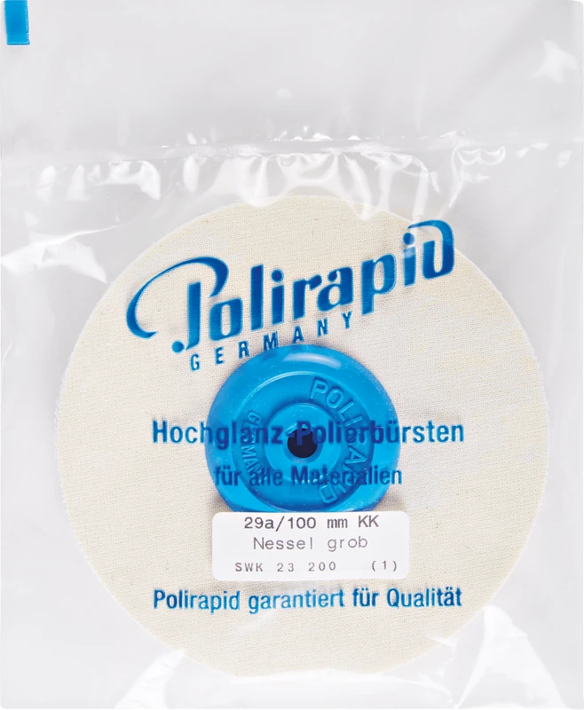 Nesselschwabbel mit konischem Kunststoff (KK)- oder Lederkern (LK) in verschiedenen Durchmessern und Stärken. Polierscheiben aus feinem oder gobem Baumwollstoff (Nessel).