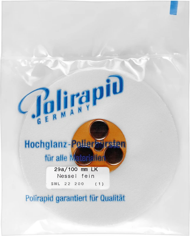 Nesselschwabbel mit konischem Kunststoff (KK)- oder Lederkern (LK) in verschiedenen Durchmessern und Stärken. Polierscheiben aus feinem oder gobem Baumwollstoff (Nessel).
