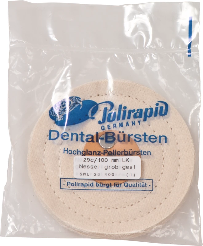 Nesselschwabbel mit konischem Kunststoff (KK)- oder Lederkern (LK) in verschiedenen Durchmessern und Stärken. Polierscheiben aus feinem oder gobem Baumwollstoff (Nessel).