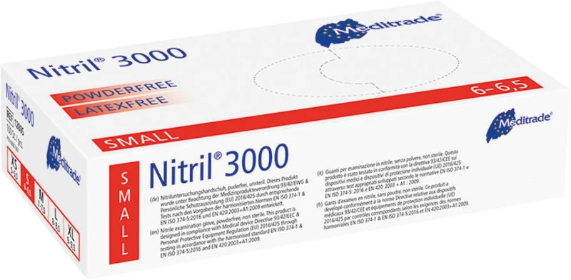 Nitril® 3000 - Der weiße Nitriluntersuchungs- und Schutzhandschuh - die beständige zweite Haut. Der Nitril® 3000 ist ein latexfreier Einmalhandschuh aus Nitrilbutadienkautschuk (NBR). Das Material ist nicht nur sehr beständig, sondern passt sich der Hand bereits nach kürzester Zeit wie eine zweite Haut an und garantiert somit ermüdungsfreies Arbeiten. Die Polymerinnenbeschichtung ermöglicht ein müheloses Anziehen.