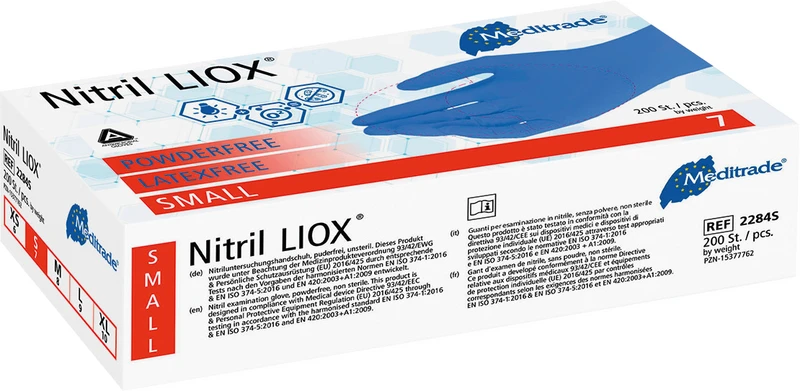 Der Nitril LIOX® ist ein latexfreier Einmalhandschuh aus Nitrilbutadienkautschuk. Im Gegensatz zu einem herkömmlichen medizinischen Untersuchungshandschuh, der nur eine passive Barriere zwischen Mikroorganismen und den Händen darstellt, spielt der antimikrobielle Handschuh Nitril LIOX® auch eine aktive Rolle um die Verbreitung von (Krankenhaus-) Infektionen zu verringern. Beidhändig passend, mit Rollrand, blauviolett, puderfrei, texturiert, unsteril, für den Einmalgebrauch.