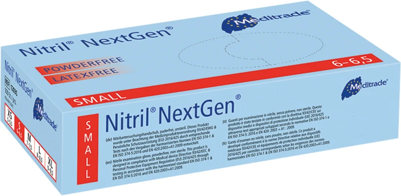 Nitril® NextGen® Untersuchungshandschuhe aus Nitril - sehr dehnbar, höchster Tragekomfort, latex ähnliche Eigenschaften, puderfrei, für den Einmalgebrauch. Medizinischer Handschuh und PSA (Persönliche Schutzausrüstung) der Kat. III, getestet nach EN 374 (Schutz gegen Chemikalien und Mikroorganismen). Geeignet für den Umgang mit Reinigungs- und Desinfektionsmitteln und für weitere Anwendungen im Labor, in der Pharmaindustrie, für die professionelle Reinigung, im Catering und für den Umgang mit Lebensmitteln im Allgemeinen. Geeignet für Anwender mit diagnostizierter Latexallergie (Typ I).