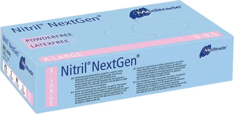 Nitril® NextGen® Untersuchungshandschuhe aus Nitril - sehr dehnbar, höchster Tragekomfort, latex ähnliche Eigenschaften, puderfrei, für den Einmalgebrauch. Medizinischer Handschuh und PSA (Persönliche Schutzausrüstung) der Kat. III, getestet nach EN 374 (Schutz gegen Chemikalien und Mikroorganismen). Geeignet für den Umgang mit Reinigungs- und Desinfektionsmitteln und für weitere Anwendungen im Labor, in der Pharmaindustrie, für die professionelle Reinigung, im Catering und für den Umgang mit Lebensmitteln im Allgemeinen. Geeignet für Anwender mit diagnostizierter Latexallergie (Typ I).