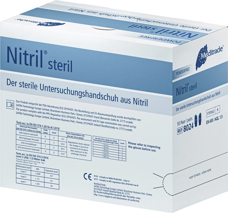 Produktinformationen "Nitril® steril Packung 50 Paar Handschuhe blau steril, puderfrei, latexfrei, Größe XL"