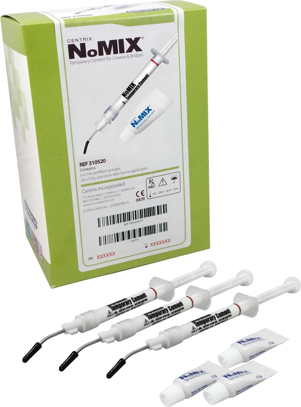 NoMIX® provisorischer Zement ist ein feuchtigkeitsaktivierter, weißer, eugenolfreier Ein-Komponenten-Zement für das temporäre Einzementieren von Kronen und Brücken. Er kann mit Kronen aus temporären oder definitiven Materialien (Acrylat, Komposit, VMK etc.) verwendet werden. Äußerst einfache Anwendung, Entnahme und Versäuberung. NoMIX® provisorischer Zement wird in 1 ml-Spritzen oder 0,5 g-Einheitsdosen für häusliche Anwendungen geliefert.