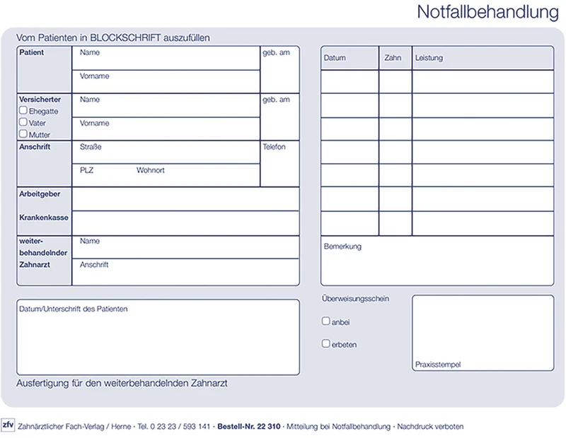 Selbstdurchschreibendes Formular für Notfallbehandlungen: ein Exemplar für den weiterbehandelnden Zahnarzt und ein Karteibeleg mit Alphabetleiste für die Kundenkartei.