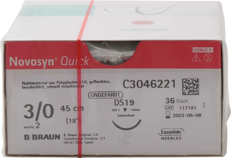 Produktinformationen "Novosyn® QUICK Packung 36 Stück ungefärbt, 45 cm, DS19, 3\8 Kreis, schneidend, 19 mm, USP 3\0"