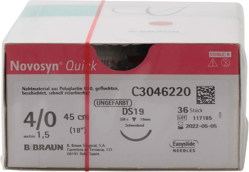 Produktinformationen "Novosyn® QUICK Packung 36 Stück ungefärbt, 45 cm, DS19, 3\8 Kreis, schneidend, 19 mm, USP 4\0"