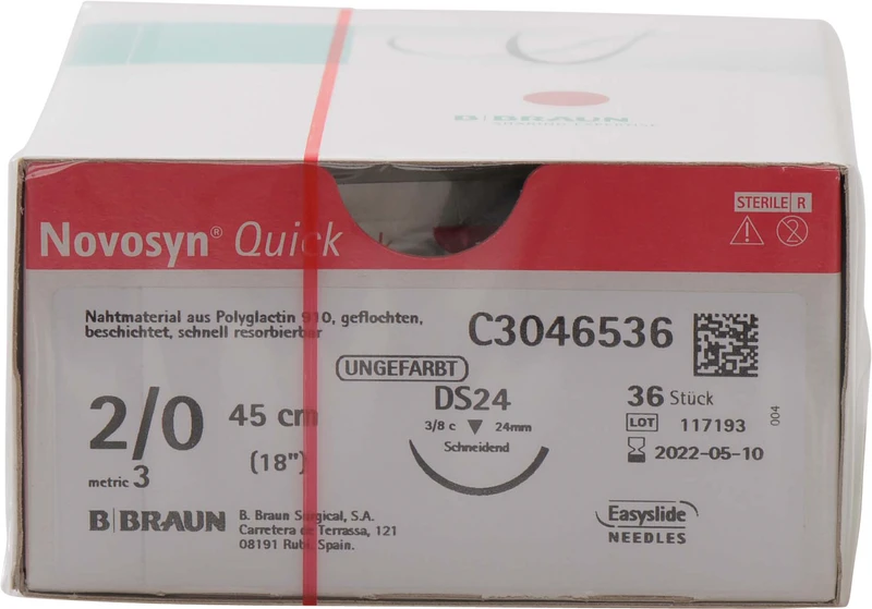 Produktinformationen "Novosyn® QUICK Packung 36 Stück ungefärbt, 45 cm, DS24, 3\8 Kreis, schneidend, 24 mm, USP 2\0"