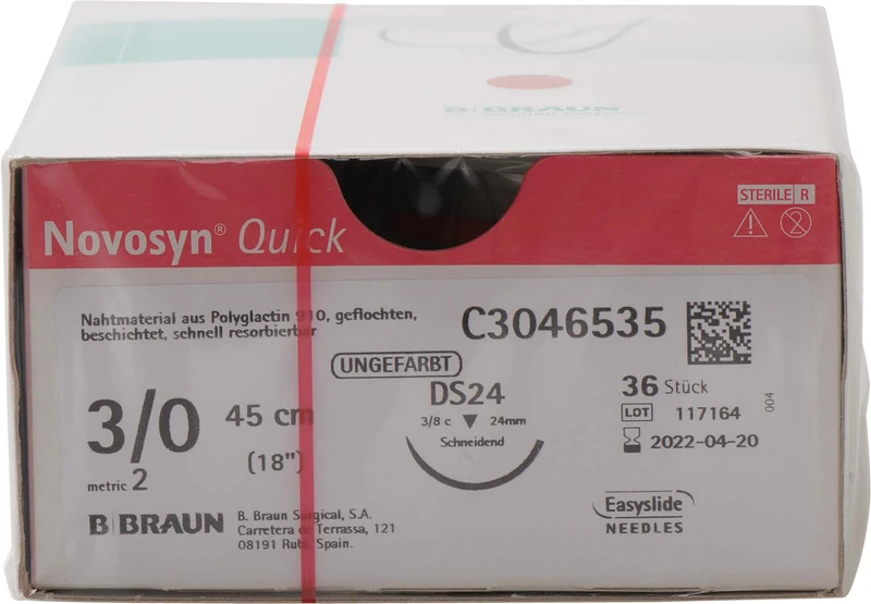 Produktinformationen "Novosyn® QUICK Packung 36 Stück ungefärbt, 45 cm, DS24, 3\8 Kreis, schneidend, 24 mm, USP 3\0"
