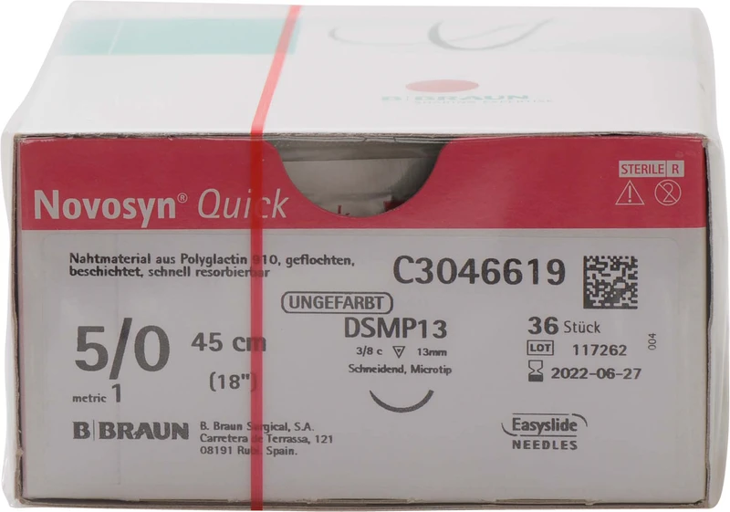 Novosyn® QUICK Packung 36 Stück ungefärbt, 45 cm, DSMP13, 3\8 Kreis, schneidend, Mikropräzision, 13 mm, USP 5\0