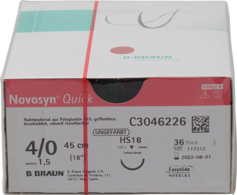 Produktinformationen "Novosyn® QUICK Packung 36 Stück ungefärbt, 45 cm, HS18, 1\2 Kreis, schneidend, 18 mm, USP 4\0"