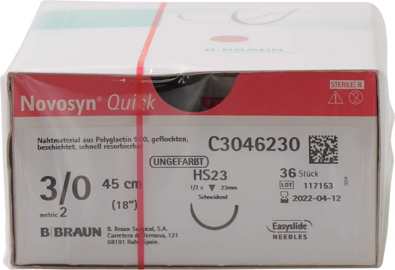 Novosyn® QUICK Packung 36 Stück ungefärbt, 45 cm, HS23, 1\2 Kreis, schneidend, 23 mm, USP 3\0