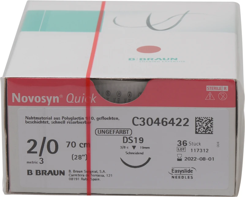 Novosyn® QUICK Packung 36 Stück ungefärbt, 70 cm, DS19, 3\8 Kreis, schneidend, 19 mm, USP 2\0