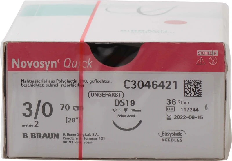 Novosyn® QUICK Packung 36 Stück ungefärbt, 70 cm, DS19, 3\8 Kreis, schneidend, 19 mm, USP 3\0