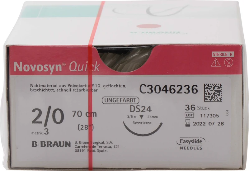 Produktinformationen "Novosyn® QUICK Packung 36 Stück ungefärbt, 70 cm, DS24, 3\8 Kreis, schneidend, 24 mm, USP 2\0"