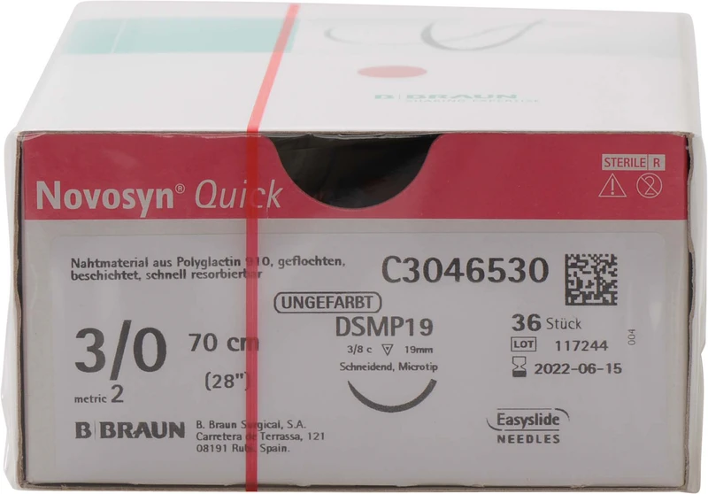 Novosyn® QUICK Packung 36 Stück ungefärbt, 70 cm, DSMP19, 3\8 Kreis, schneidend, Mikropräzision, 19 mm, USP 3\0