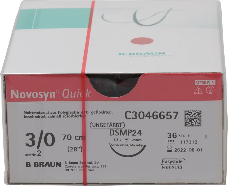 Novosyn® QUICK Packung 36 Stück ungefärbt, 70 cm, DSMP24, 3\8 Kreis, schneidend, Mikropräzision, 24 mm, USP 3\0