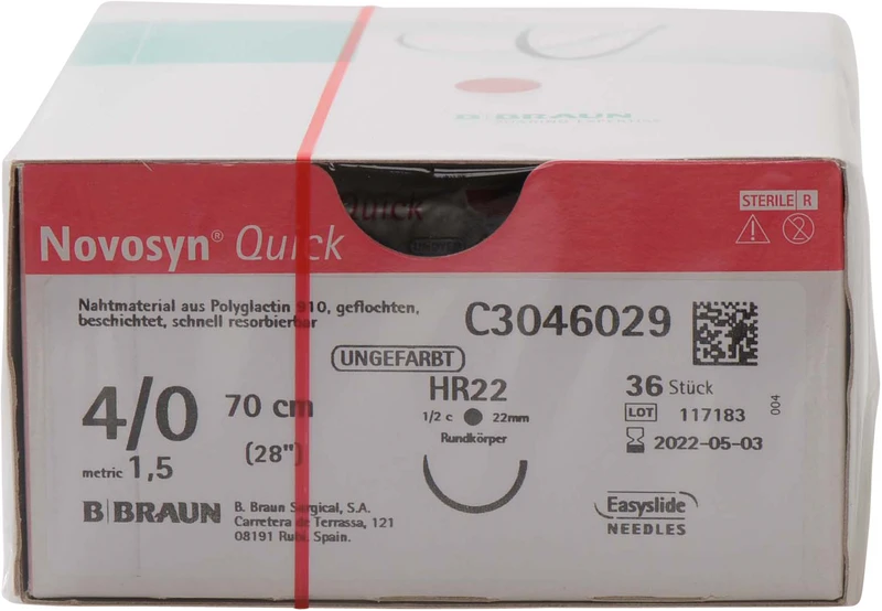 Novosyn® QUICK Packung 36 Stück ungefärbt, 70 cm, HR22, 1\2 Kreis, Rundkörper, 22 mm, USP 4\0