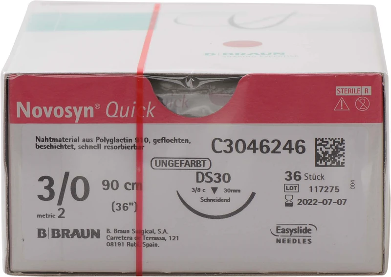 Novosyn® QUICK Packung 36 Stück ungefärbt, 90 cm, DS30, 3\8 Kreis, schneidend, 30 mm, USP 3\0