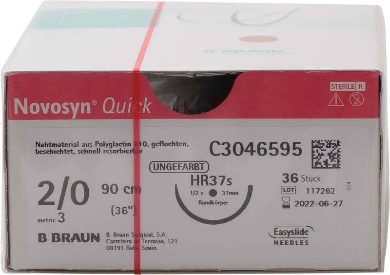 Novosyn® QUICK Packung 36 Stück ungefärbt, 90 cm, HR37S, 1\2 Kreis, Rundkörper, stark, 37 mm, USP 2\0