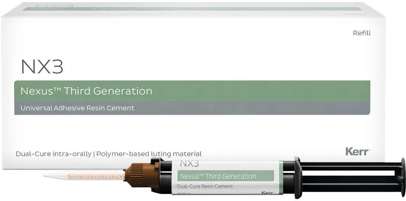 Die neue Generation des adhäsiven Befestigungszements NX3 ist sowohl mit Total-Etch als auch mit Self-Etch Adhäsiven kompatibel. NX3 zeichnet sich durch hervorragende Farbstabilität, hohe Transluzenz und hervorragende Haftkraft aus. NX3 ist für zeitaufwendige Restaurationen als lichthärtender Zement in der Standard Spritze erhältlich. Zusätzlich wird NX3 in der praktischen Automixspritze als dualhärtender Zement angeboten, wodurch die Verwendung eines Aktivators bei Indikationen mit geringer oder ohne Lichteinwirkung entfällt. Die Röntgenopazität liegt bei über 330 %.