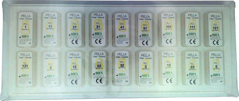ODUS Pella Kronen sind transparente Streifenkronen, die für die Konturierung von restaurativem Material und die Anpassung des natürlichen Gebisses mittels "Peel-Off" -Technik entwickelt wurden.Die große Auswahl an verfügbaren Formen und Größen ermöglicht es, das natürliche Gebiss auf einfache und schnelle Weise mit minimaler Nachbearbeitung anzupassen. Die Kronenformen bieten eine überlegene Ästhetik als andere Konturierungstechniken, da sie das restaurative Material automatisch an das natürliche Gebiss anpassen. Die Produkttransparenz ermöglicht den Einsatz von lichthärtenden Verbundwerkstoffen als restaurative Materialien. Darüber hinaus hinterlässt die einfache Abisolierung der Kronenform nach dem Harzhärten (Peel Off Technik) eine glatte Oberfläche, die nur eine minimale Nachbearbeitung erfordert, während die dünnen interproximalen Wände enge Kontakte zwischen den Zähnen ermöglichen.Das Produkt ist in 39 verschiedenen Formen/Größen erhältlich, sowohl für die Kinder- als auch für die Erwachsenenzahnheilkunde. Die Kronenformen sind nach einer bestimmten Tabelle nummeriert, um jede verfügbare Form/Größe genau zu identifizieren. Sie sind in verschiedenen Schalen verpackt und präsentieren 39 Einzelpaare (rechts und links), 18 Einzelpaare (rechts und links) oder in Nachfüllungen von 6er-Einzelpaaren (rechts und links).Zusätzlich zu den transparenten Kronenformen von Pella bietet PD weitere Konturierungsoptionen wie transparente Streifen, ideal für die Wiederherstellung der Frontzähne mit lichthärtenden Materialien, und Matrixbänder und -halterungen, ideal für Frontzähne.
