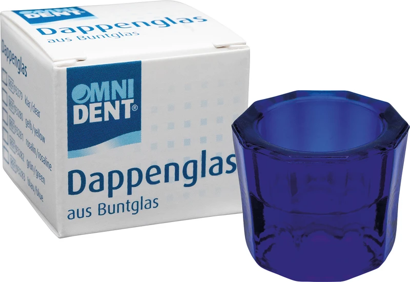 Aus farbigem Glas. Zehnkantig, griffsicher, auf beiden Seiten unterschiedlich ausgeformt. Geeignet zum Anrühren von Zementen und Kunststoffen. Größe 32 mm im Durchmesser, 30 mm hoch, ca. 2-3 ml Fassungsvermögen. Nicht autoklavierbar.