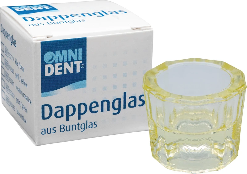 Aus farbigem Glas. Zehnkantig, griffsicher, auf beiden Seiten unterschiedlich ausgeformt. Geeignet zum Anrühren von Zementen und Kunststoffen. Größe 32 mm im Durchmesser, 30 mm hoch, ca. 2-3 ml Fassungsvermögen. Nicht autoklavierbar.
