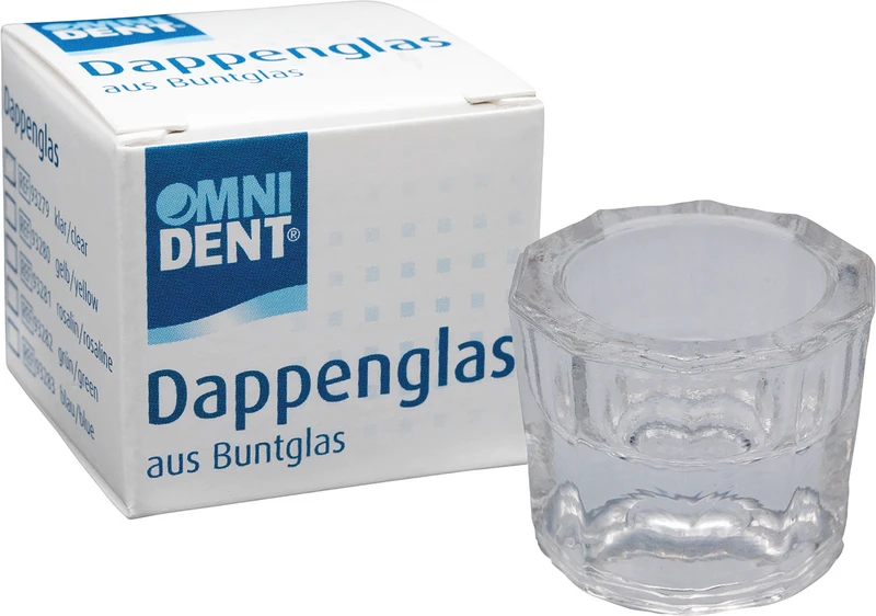 Aus farbigem Glas. Zehnkantig, griffsicher, auf beiden Seiten unterschiedlich ausgeformt. Geeignet zum Anrühren von Zementen und Kunststoffen. Größe 32 mm im Durchmesser, 30 mm hoch, ca. 2-3 ml Fassungsvermögen. Nicht autoklavierbar.