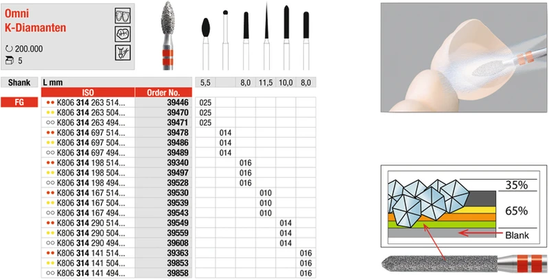 Vollkeramik-ZrO2 Bearbeitung mit Diamantinstrumenten unter Wasserkühlung. Die Multilayer-Diamanten garantieren noch höhere Standzeiten auf harten Vollkeramikmaterialien. Das neue Herstellungs-Verfahren mit spezieller Matrix-Bindung verhindert ein Ausbrechen einzelner Diamantkörner und erhöht die Standzeit um ein Vielfaches. Die Feinkorn-Diamantierung sorgt für optimale Schneidleistung und hohe Abtragleistung während dem Trennen mit geringen Vibrationen.