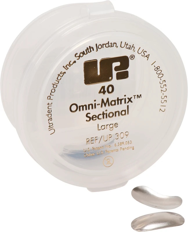 Omni-Matrix Sectional ist ein praxisgerechtes Teilmatrizensystem zur Erzielung anatomisch korrekter Interdentalkontakte. Vier verschiedene Matrizen stehen zur Verfügung, die anatomisch so vorkonturiert sind, dass sie nicht am approximalen Rand hängen bleiben und sogar an schwierigen Gingivalbereichen optimal anliegen. Die dünnen Bänder (nur 0,025 mm) ermöglichen enge Kontakte und lassen sich leicht an jede Zahnform anpassen. Der Federring, eine Form für alle Fälle geeignet, kann mit jeder Kofferdam-Klammerzange gesetzt werden. Seine gekrümmten Enden passen perfekt auf die gebogenen, konvexen Zahnfl ächen. Mehrere Federringe können hintereinander gesetzt werden, so dass sie sich teilweise überlappen. So können mehrere Flächen eines Zahns oder mehrere Zähne eines ieferquadranten parallel behandelt werden. Federringe stets erst einsetzen, nachdem die Matrizen eingesetzt UND verkeilt wurden! Matrizen und Federringe können auch mit anderen Teilmatrizen-Fabrikaten kombiniert werden.