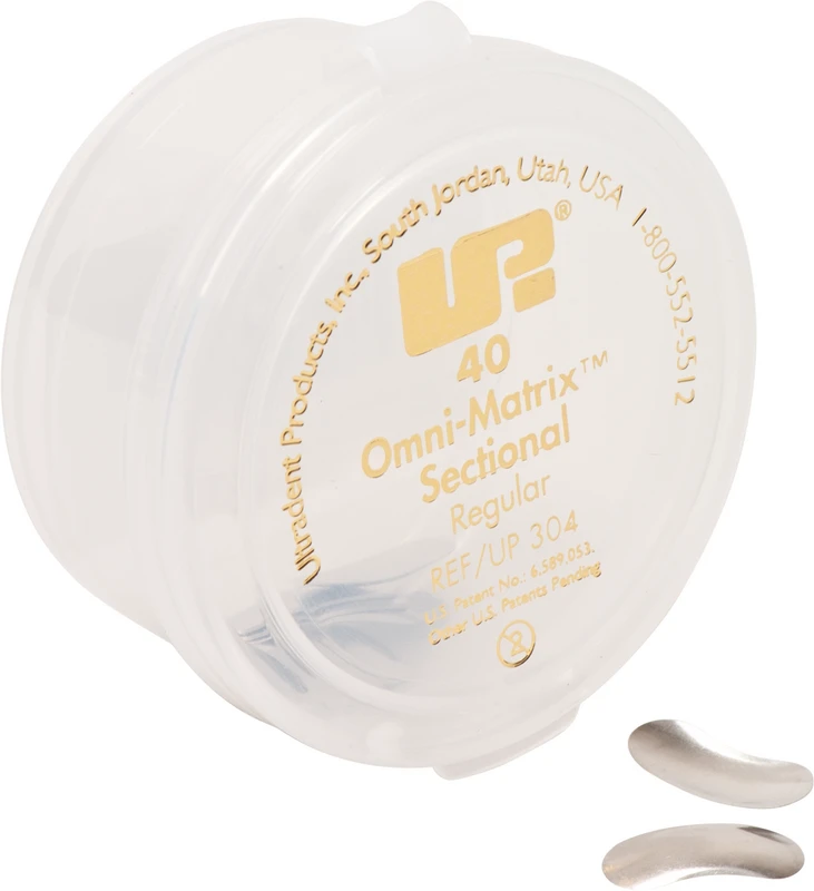 Omni-Matrix Sectional ist ein praxisgerechtes Teilmatrizensystem zur Erzielung anatomisch korrekter Interdentalkontakte. Vier verschiedene Matrizen stehen zur Verfügung, die anatomisch so vorkonturiert sind, dass sie nicht am approximalen Rand hängen bleiben und sogar an schwierigen Gingivalbereichen optimal anliegen. Die dünnen Bänder (nur 0,025 mm) ermöglichen enge Kontakte und lassen sich leicht an jede Zahnform anpassen. Der Federring, eine Form für alle Fälle geeignet, kann mit jeder Kofferdam-Klammerzange gesetzt werden. Seine gekrümmten Enden passen perfekt auf die gebogenen, konvexen Zahnfl ächen. Mehrere Federringe können hintereinander gesetzt werden, so dass sie sich teilweise überlappen. So können mehrere Flächen eines Zahns oder mehrere Zähne eines ieferquadranten parallel behandelt werden. Federringe stets erst einsetzen, nachdem die Matrizen eingesetzt UND verkeilt wurden! Matrizen und Federringe können auch mit anderen Teilmatrizen-Fabrikaten kombiniert werden.