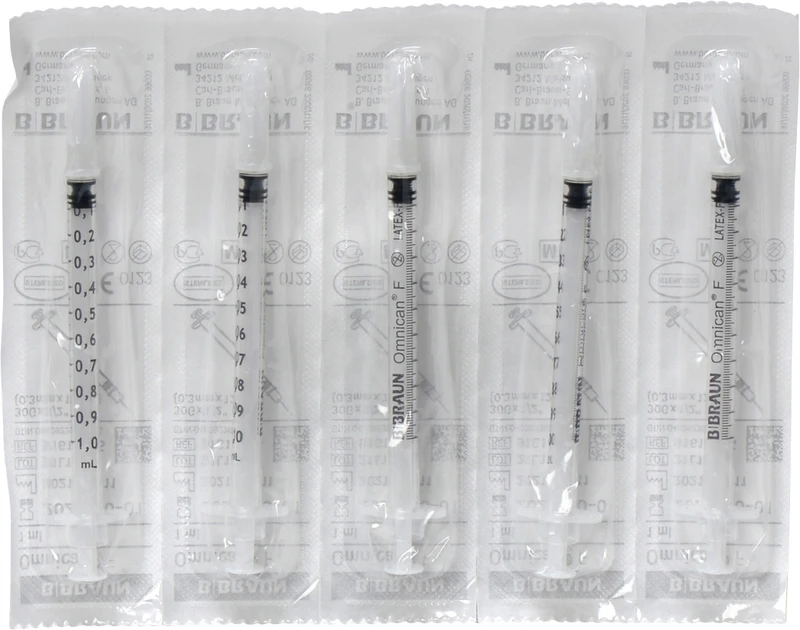 Omnican®-F mit integrierter Kanüle, 10 x 10 Stück im Polybeutel; die Innensterilität der einzelnen Spritzen ist auch nach dem Öffnen des Polybeutels gewährleistet (weiße Schutzkappen an den Enden der Spritze garantieren Sterilität). Nach EN ISO 8537 und EN ISO 7886-1.