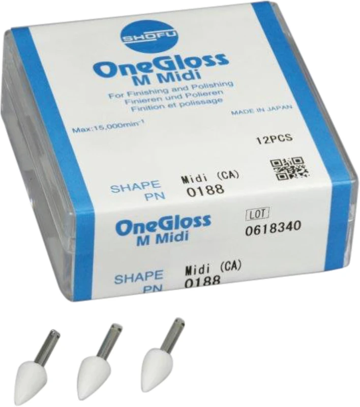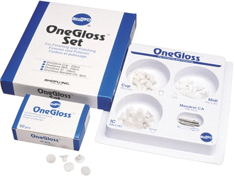 Das Sortiment umfasst vier Formen, die optimal auf die zu bearbeitenden Zahnflächen abgestimmt sind. Die OneGloss M Instrumente, bei denen die Polieraufsätze auf einem Winkelstück-Schaft aus Edelstahl montiert wurden, sind sterilisierbar. Als Einwegvarianten stehen die unmontierten OneGloss- und die auf einem strapazierfähigen Kunststoff-Mandrell vormontierten OneGloss PS Polierer zur Verfügung.