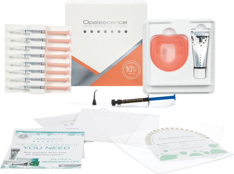 Doctor Set 8 x 1,2 ml Spritze Melone 10 %, 2 Sof-Tray-Folien 0,9 mm, 1 Farbschlüssel, 1 Aufbewahrungsbox, 1,2 ml LC Block-Out Resin, 20 ml Opalescence Zahncreme, 1 Black Mini Tip